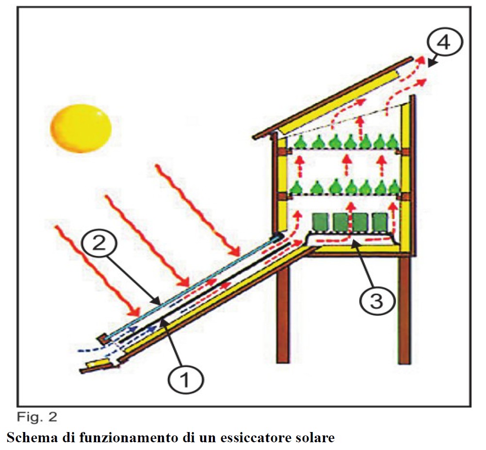 Come potete dedurre dalla Fig. 2 qui a lato, i raggi solari riscaldano la lamiera in rame (1) colorata di nero per ottenere un maggior assorbimento di calore. Questa lamiera di rame fortemente riscaldata fa in modo che anche l'aria che la circonda diventi calda. Il plexiglas (2) che ricopre la lamiera di rame fa in modo che quest'aria calda non possa fuoriuscire (stesso principio dell'effetto serra). L'aria calda è più leggera ed inizia cosi a salire verso l'alto, nella camera di essiccazione (3). Qui sistemati sui ripiani forati , si trovano gli alimenti che devono essere essiccati. L'aria calda toglie i liquidi agli alimenti, si raffredda e fuoriesce attraverso delle aperture (4) precedentemente fatte sul coperchio. Nel frattempo aria più fredda sale dal basso, si riscalda lentamente grazie alla lamiera di rame ed infine sale verso l'alto. Nasce cosi un flusso di aria calda che secca lentamente la nostra frutta, gli ortaggi o altri alimenti. L'intenso flusso di aria consente di ottenere un buon grado di essiccazione in tempi rapidi, al riparo da agenti atmosferici ed altri elementi che potrebbero danneggiare il prodotto. La temperatura massima della camera di essiccazione non supera mai i 60°C, questo consente il mantenimento degli olii essenziali e delle proprietà organolettiche dei prodotti trattati.